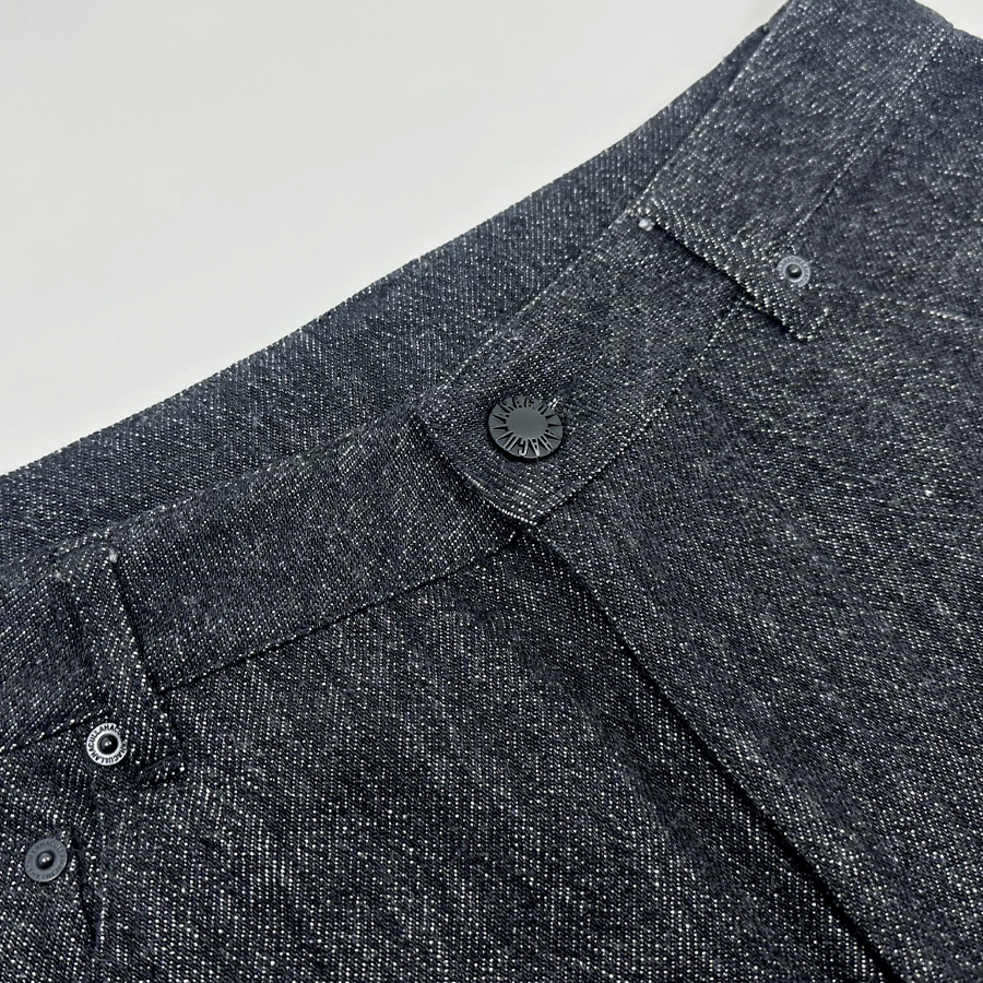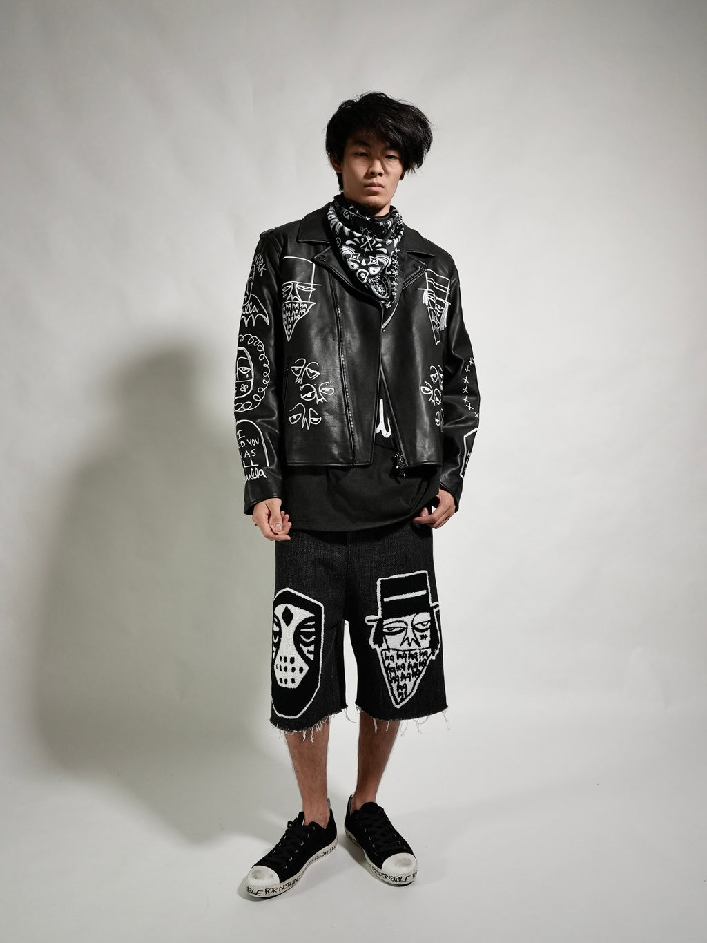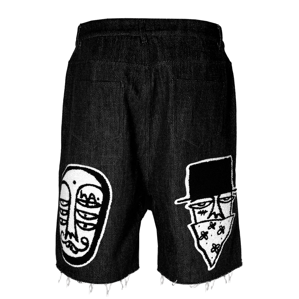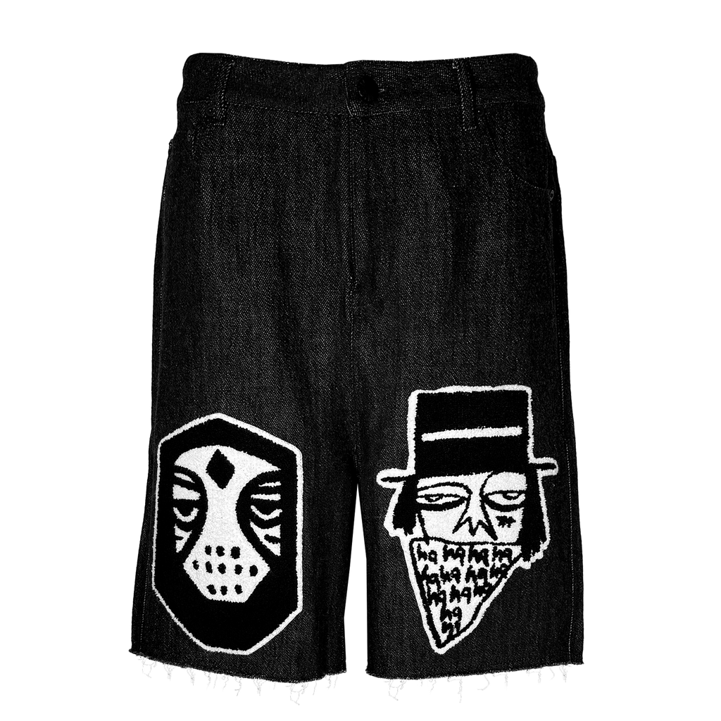 Black bugle, soft wide leg, long denim shorts with fly zipper fastening and four original Haculla character face chenille embroideries, 1 on the front and back of each leg.