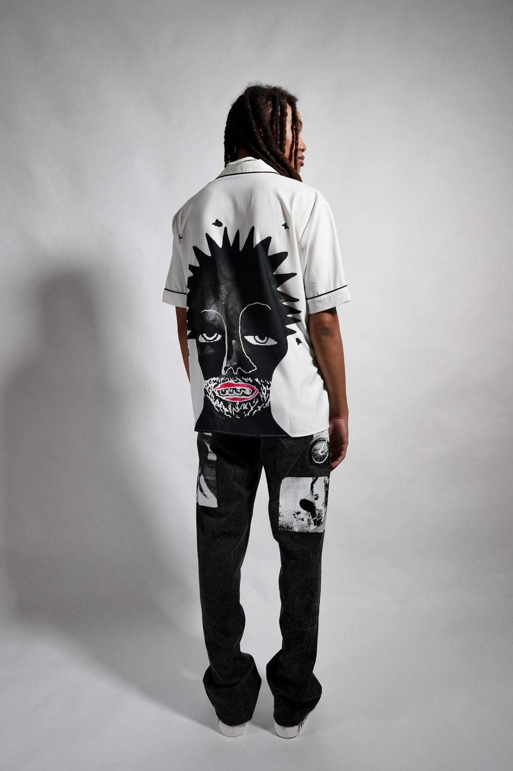 Off-White viscose short sleeve camp collar shirt with black piping, a welt pocket, and two Haculla monster faces printed on the front and back