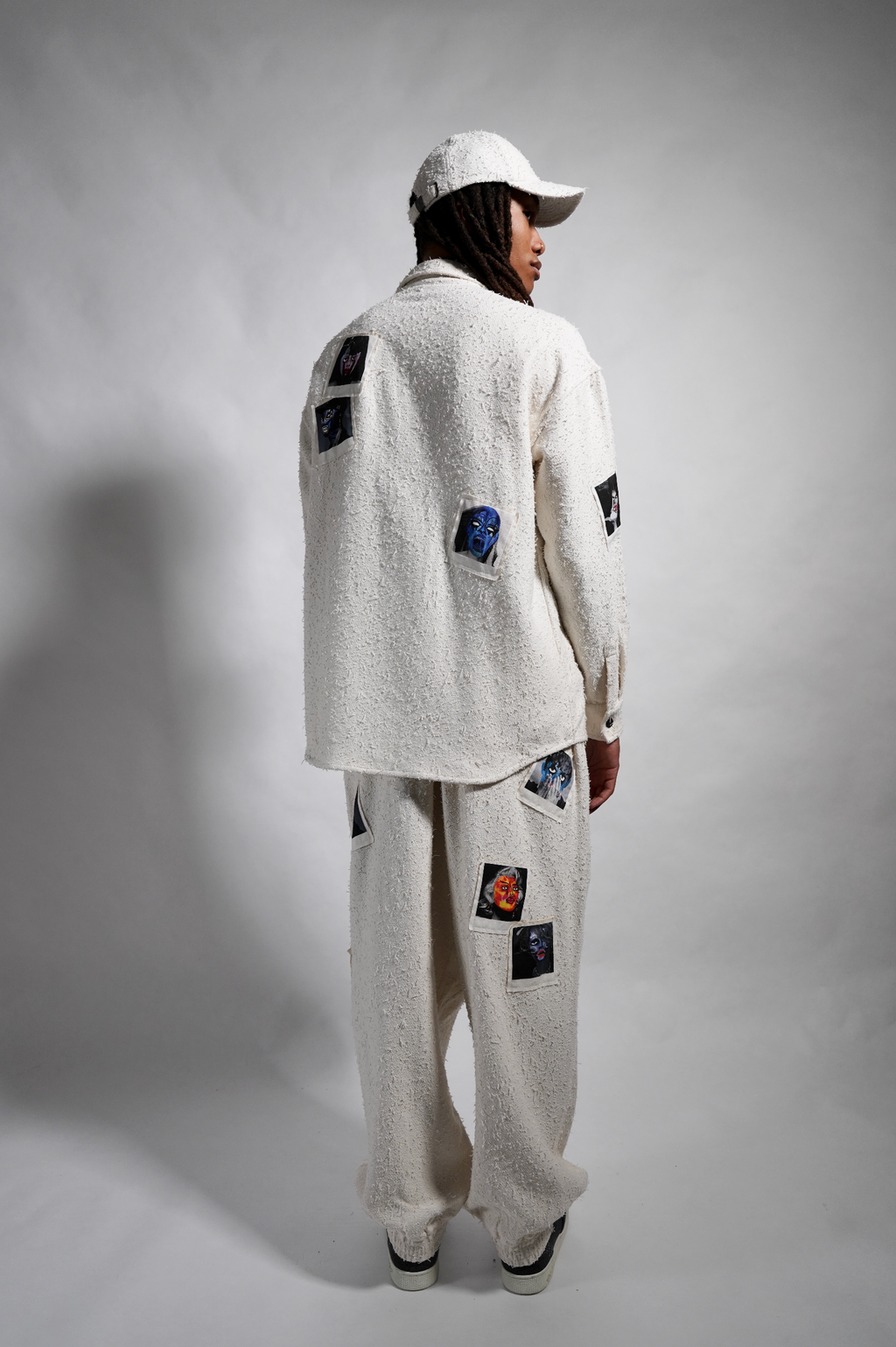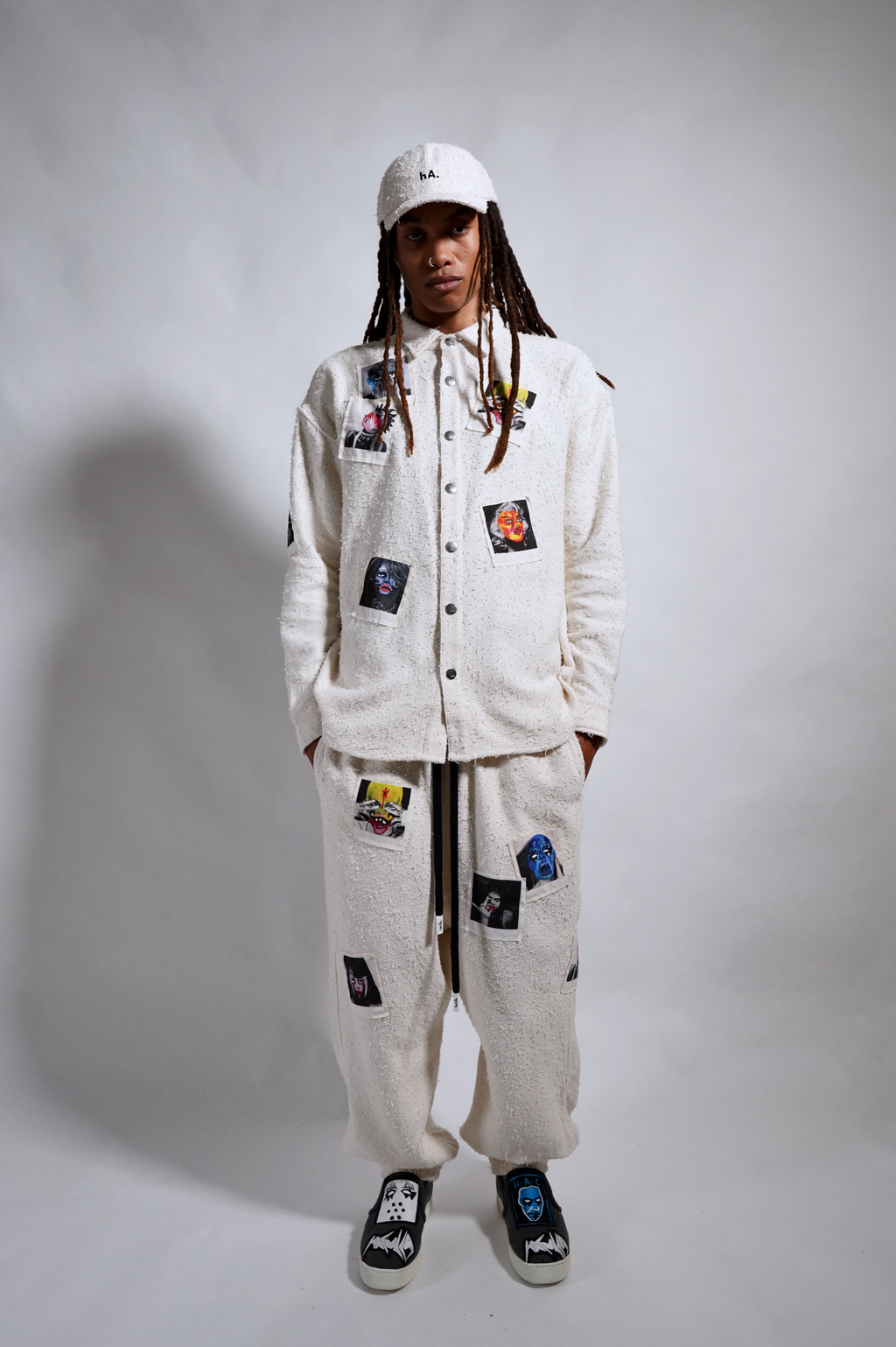 Off-White pilled cotton, oversized, drop shoulder woven shirt with snaps front closure and 9 colorful Haculla monsters printed onto canvas patches to look like polaroids