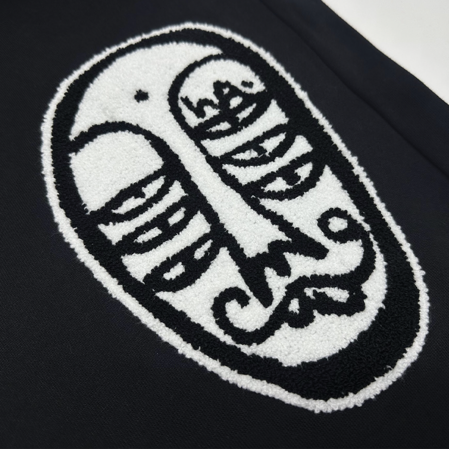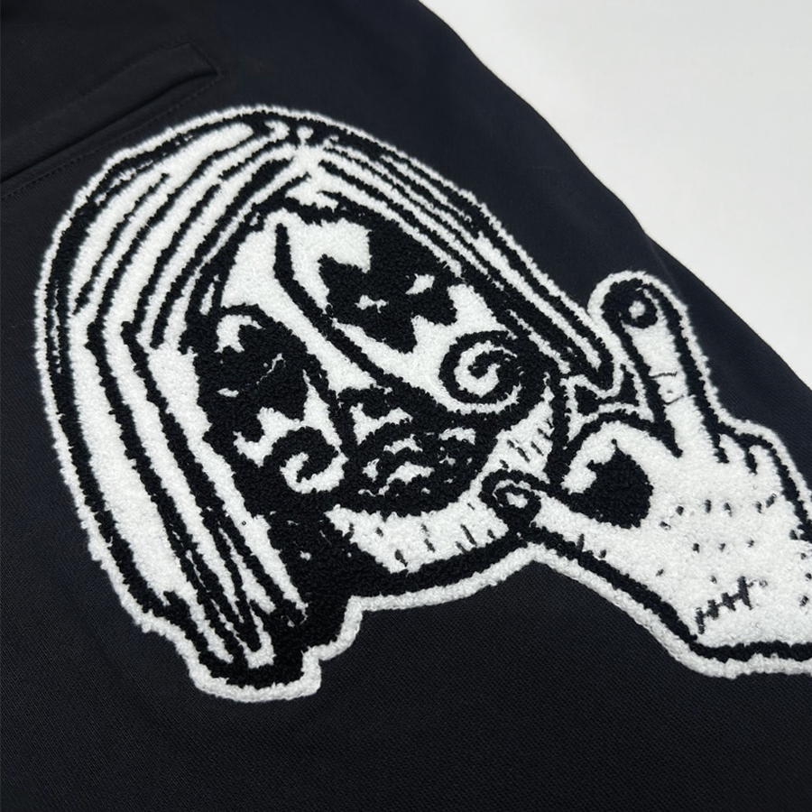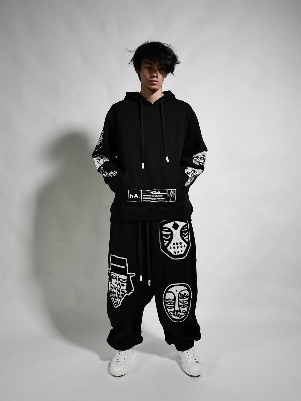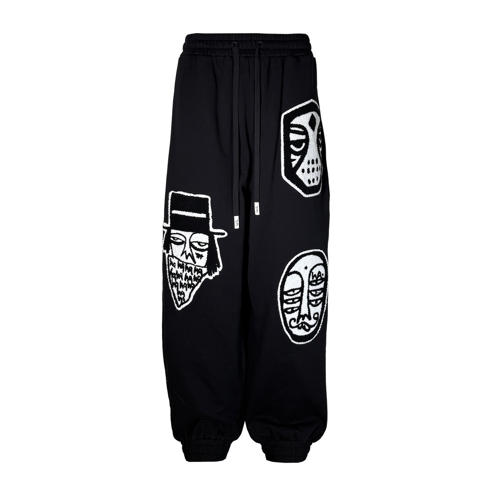 Aged black cotton french terry extremely oversized joggers. The front and back are adorned with original Haculla character face chenille embroideries, scattered throughout, and branded hand dipped drawcords.